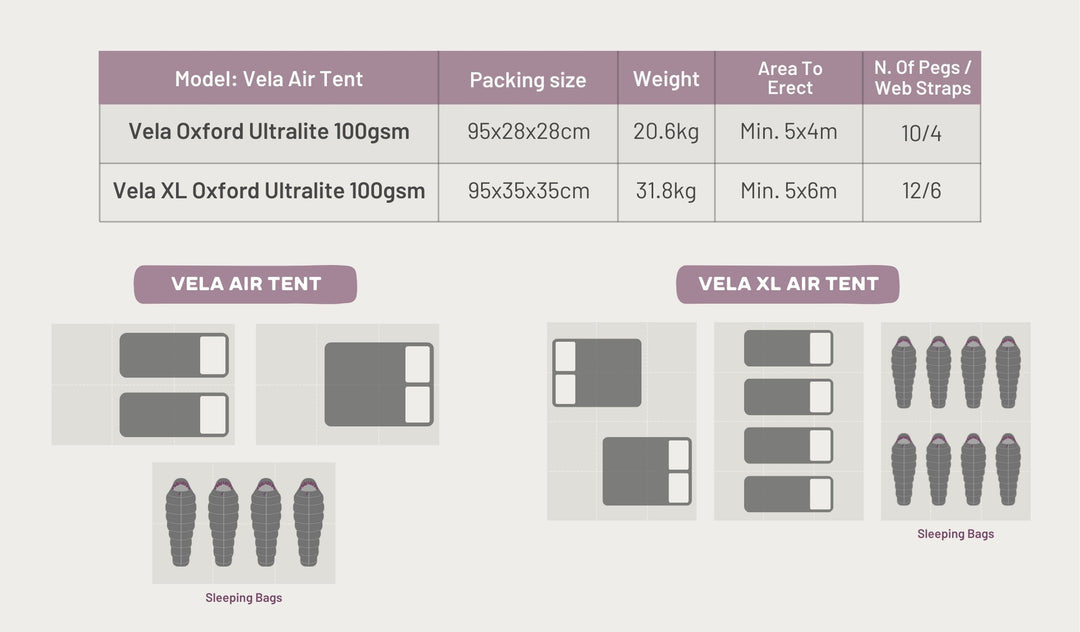 The Vela Air Tent is an inflatable tent designed for effortless setup. Just peg it down, connect the included battery pump, and it fully inflates in under 10 minutes. No hassle at all!