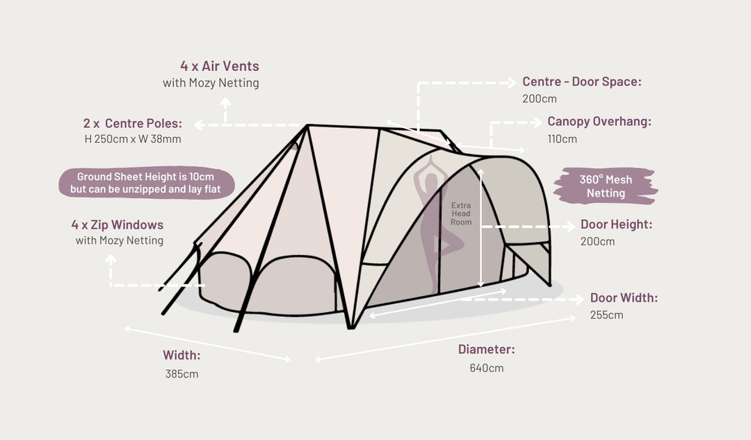 To enhance the Star Emperor Tent's durability, the fabric has been treated with a UV, rot, and water-repellent agent for longevity. Guy ropes have been replaced with resilient webbing straps.