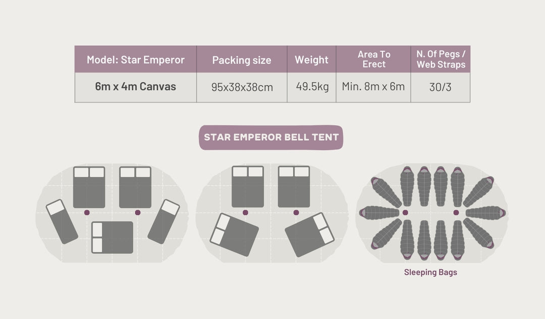 Like all our tents, the Star Emperor Tent comes neatly packed in its bag with attached webbing straps & guy ropes for door, x2 centre poles, a cross-bar pole, a-frame pole, a detachable groundsheet, smooth pegs for the base, rebar pegs for staking out the guy ropes, a mallet and a spares bag.