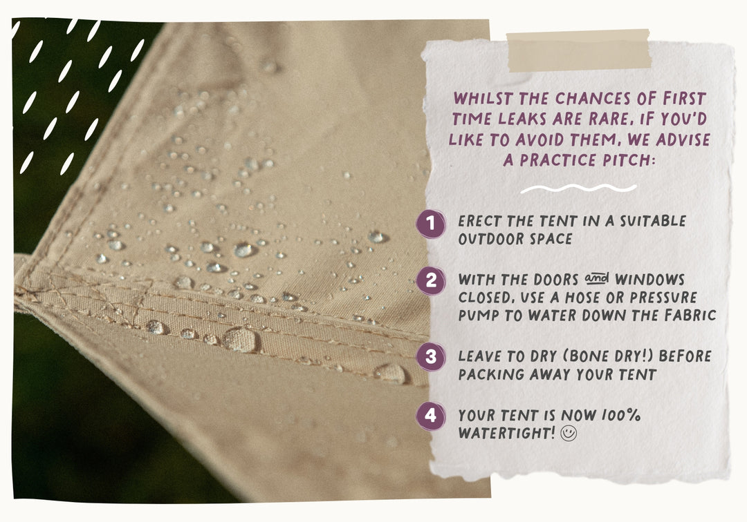 - On the first occasion that your tent experiences a heavy rainfall, although unlikely, you may find small leaks around the seams of the fabric. Do not worry, as this normal!