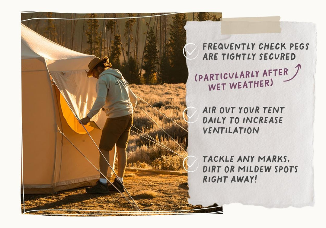 - Air out your tent daily to increase ventilation. This can be done by opening the doors, windows (and if applicable) unzipping the groundsheet and rolling up the sides.