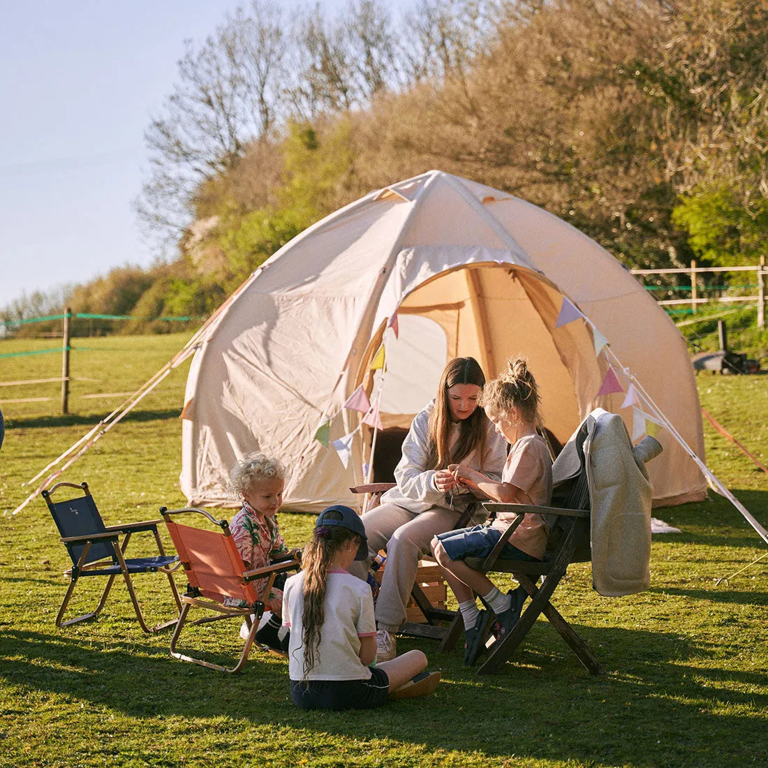 nova air dome glamping tent in a green field with children playing