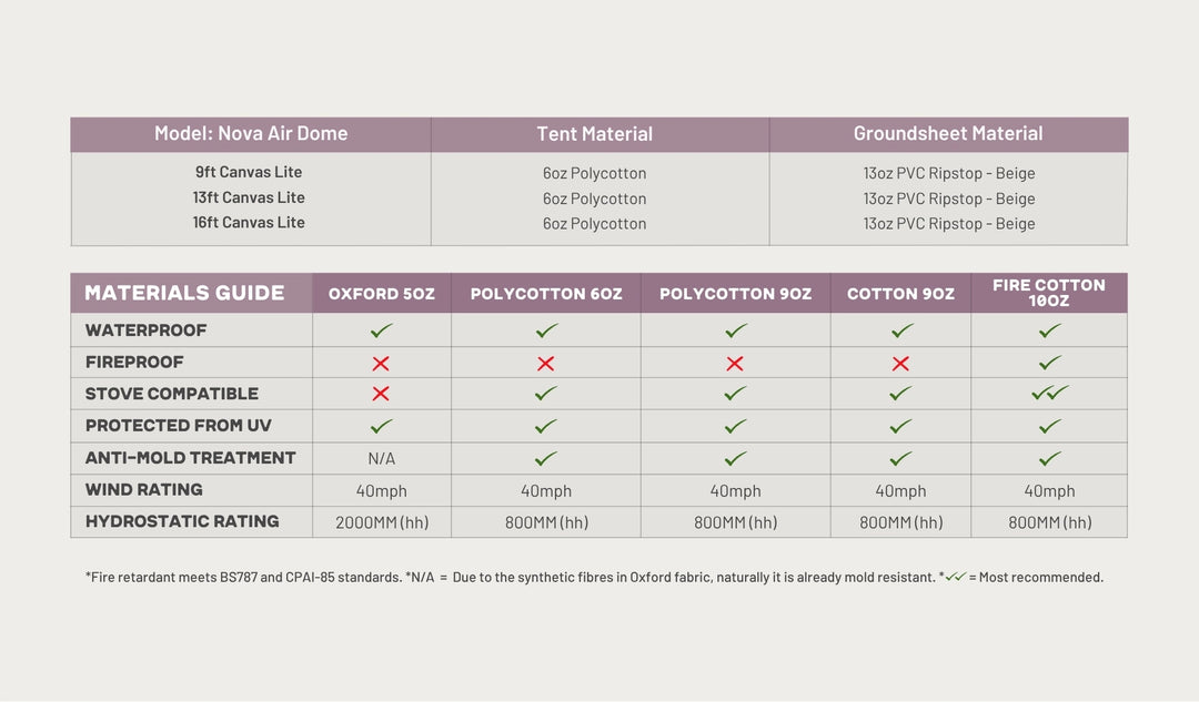 We have been using the nova dome tents for 4 years now and we absolutely love them. There’s just nothing like this on the market. The inflatable beams make the inside of tent so much more spacious than a standard bell tent.Katy, The Lazy T