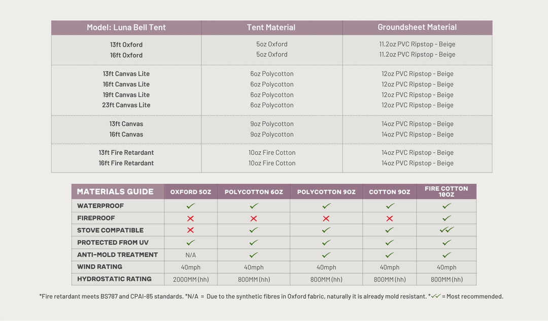 The Luna Bell has been upgraded to have stronger guy ropes tabs, and strong flexi and wall poles to enhance it's overall performance. From Spring 2026 'Oxford 100gsm' fabric has been upgraded to an increased fabric weight and thickness of 175gsm, which provides campers with a warmer tent and the tent a premium matte finish.
