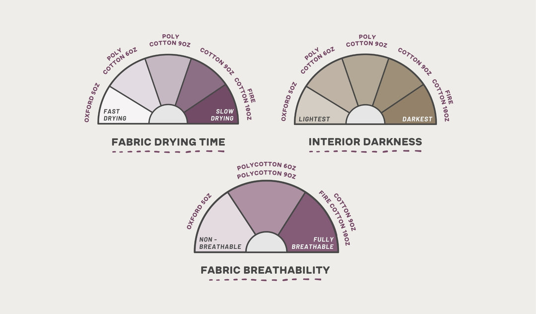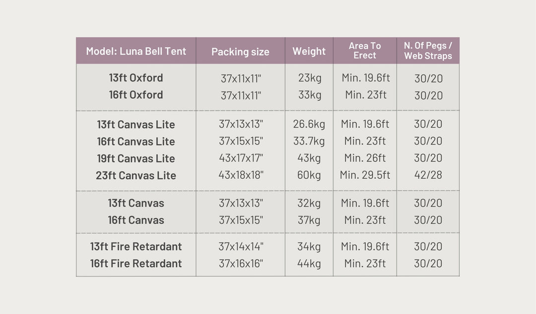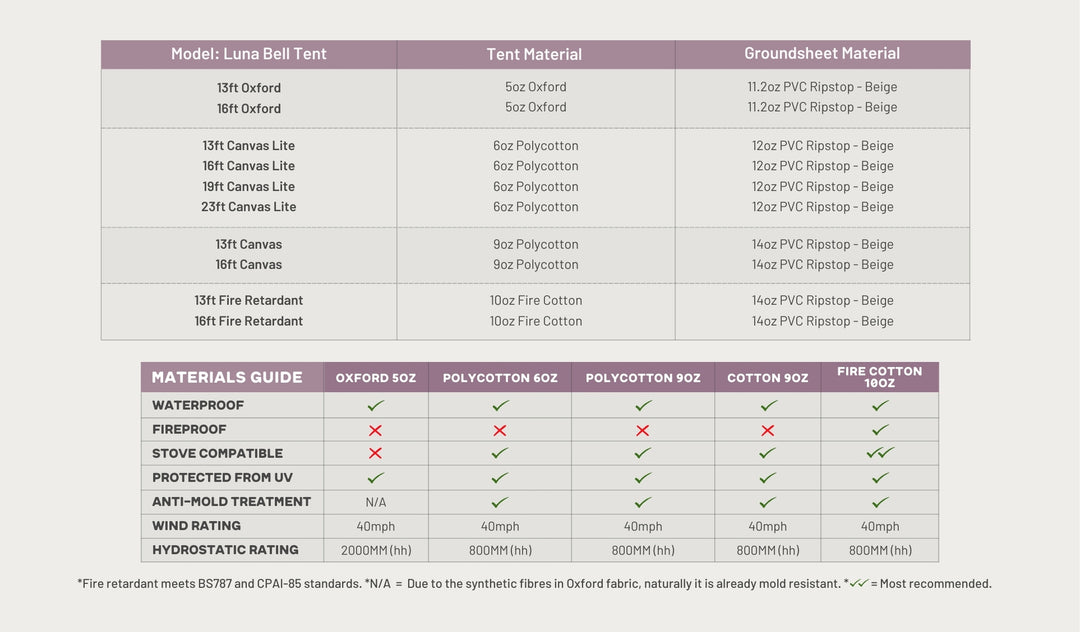 The Luna Bell has been upgraded to have stronger guy ropes tabs, and strong flexi and wall poles to enhance it's overall performance. From Spring 2026 'Oxford 100gsm' fabric has been upgraded to an increased fabric weight and thickness of 175gsm, which provides campers with a warmer tent and the tent a premium matte finish.