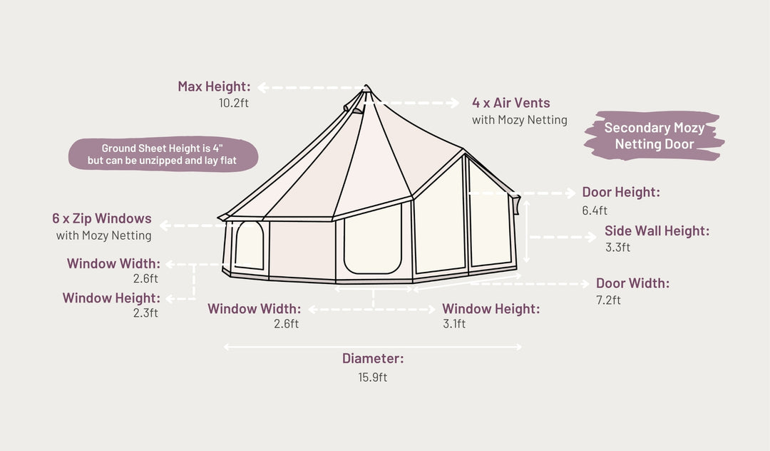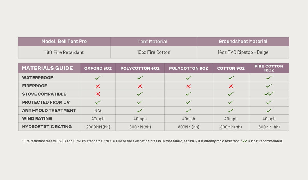 To enhance the Bell Tent Pro's durability, the cotton fabric has been treated with a fire retardant agent, UV, rot, and water-repellent agent for longevity.