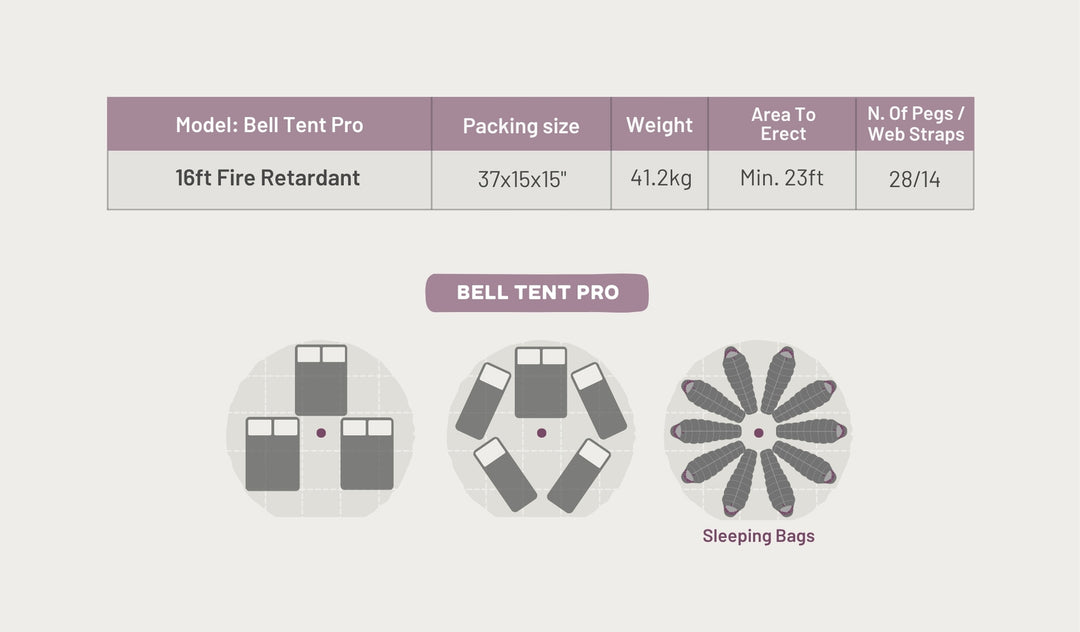 At 5m in size, the Bell Tent Pro can comfortably sleep up to 10 people in sleeping bags or 6 on beds. Check out our layout examples to get a better idea of how this may look!