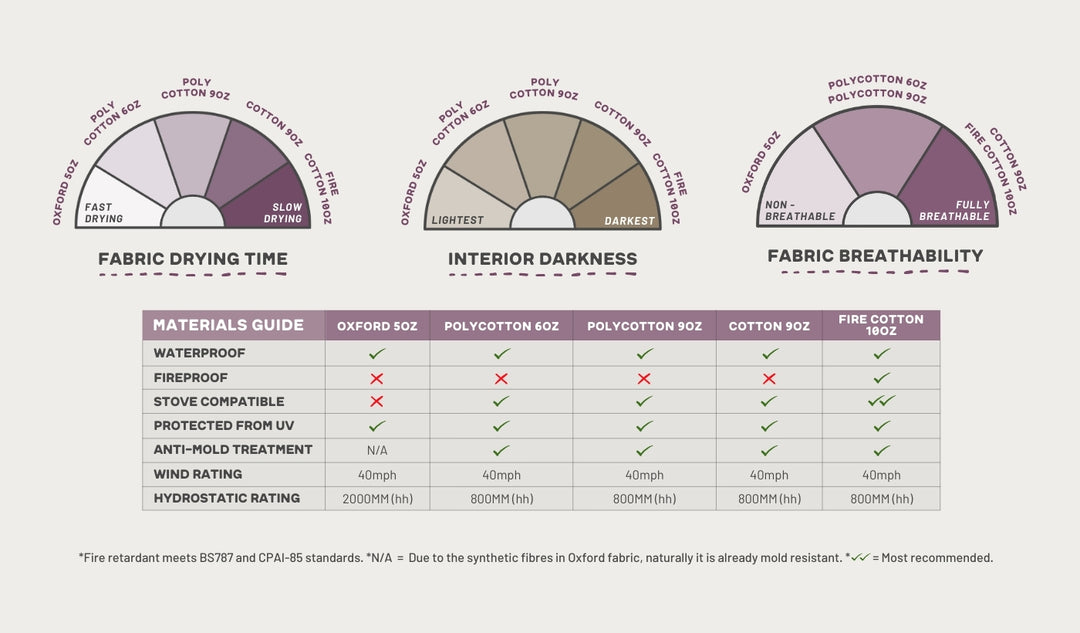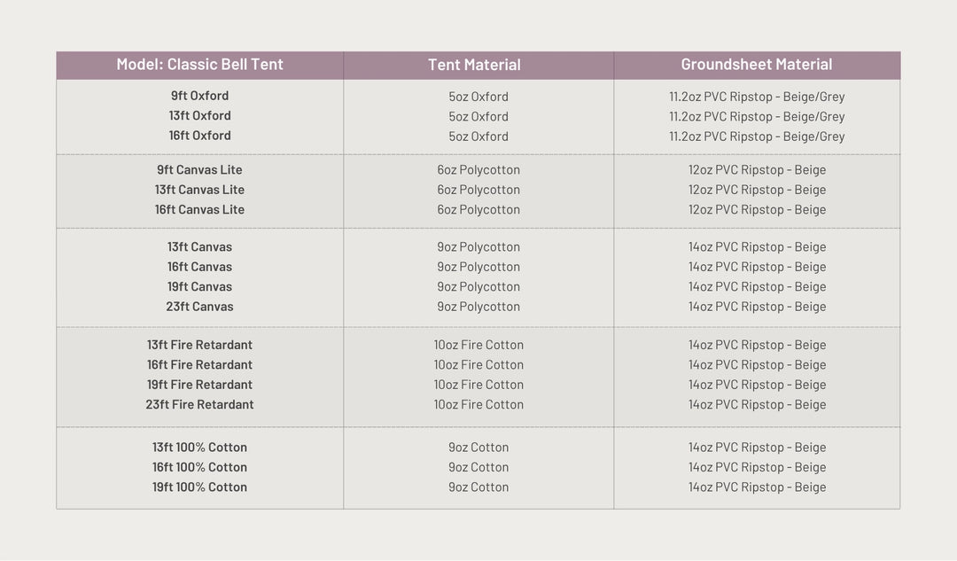 With every camper and each unique adventure facing different demands and challenges, the Classic Bell Tent has 5 versatile fabrics to choose from. Introducing our Fire Retardant Models, boasting a pre-cut stove hole and flap for effortless setup in the 4m and 5m sizes. For other sizes, you will need to cut the stove hole yourself. For other sizes, you will need to cut the stove hole yourself. Both styles require the purchase of a flashing kit when installing a stove. Use the fabric guide to compare before you camp.