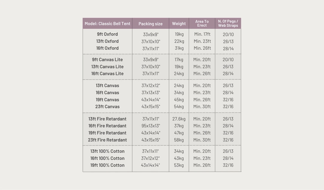 The Classic Bell Tent has seen an upgrade in the door height, with door heights increased on the 4m to 1.8m and the 5m+ to 2m. We have also made the centre poles stronger to enhance the overall performance. We have ditched 100gsm & 200gsm for a new and improved 175gsm weight, which has a luxurious matte finish.