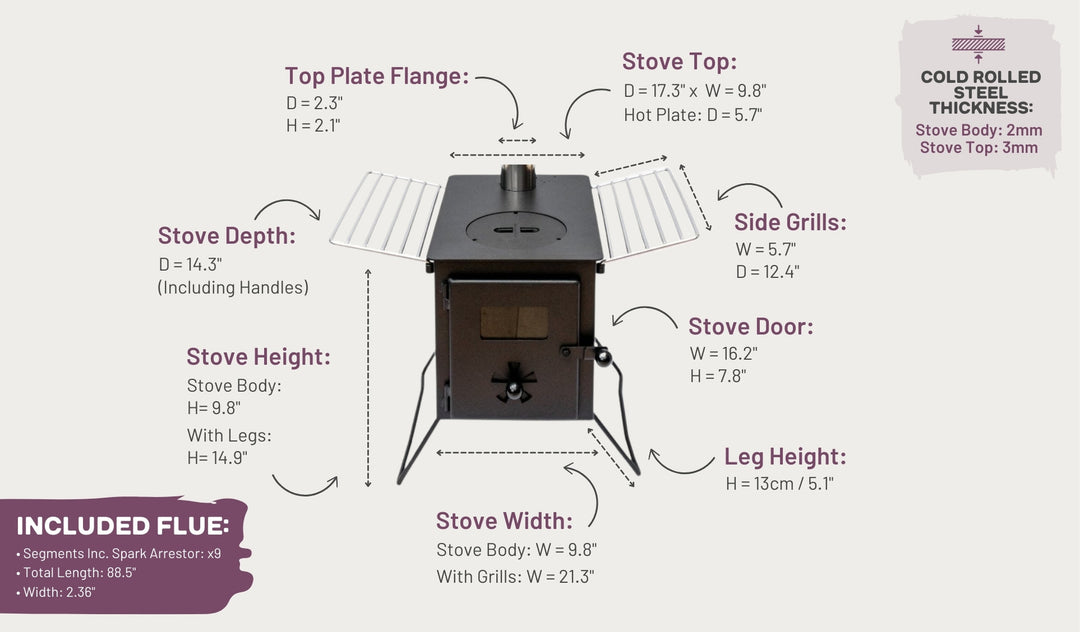 Classically styled with modern technicalities, it packs down neatly and weighs just 12kgs, making it extremely easy to transport and hand carry. The classic look of this stove will ensure you have a fully functioning heater/cooker that will add a touch of nostalgia to any fireproof or breathable fabric tent. This kit comes with optional side grills for toasting or warming, as well as a buildable flue (chimney), top plate, spark arrestor, and ashtray.