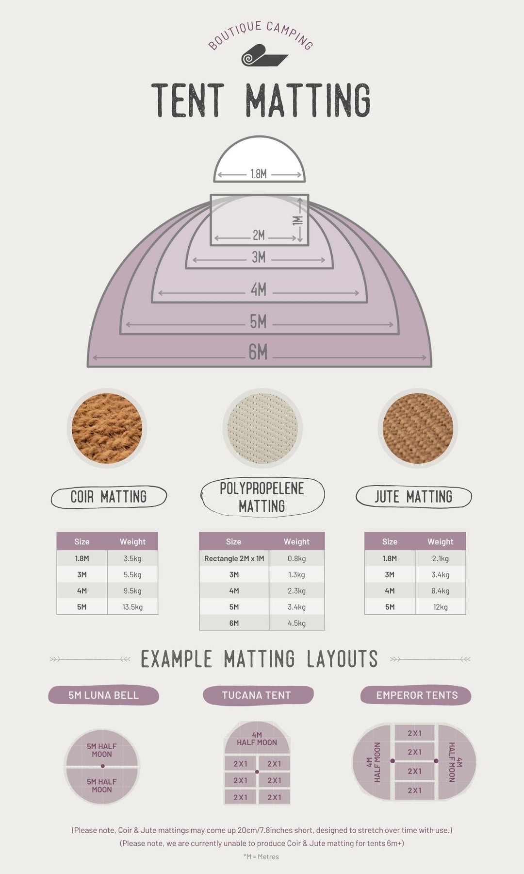 Our most popular and desirable add-on product for Boutique tent owners, this is a must-have accessory that will enhance the aesthetics of your interior. Our matting also excels in practicality, adding a comfortable and warming layer of insulation as well as protecting your groundsheet from dirt and tears caused by outside shoes or internal furniture.
