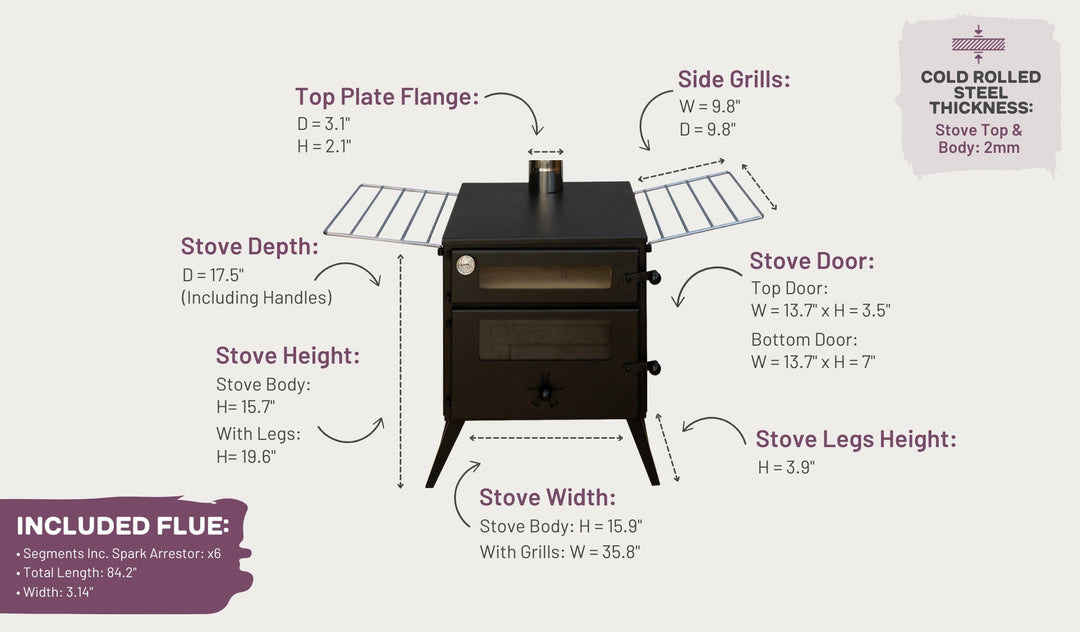 Fuelled by wood and reaching heats of 300°c/570°f, the upper oven cooks you and your camping companions perfect pizzas in just 4 minutes - with the non-stick cordierite stone achieving 12" of evenly-baked pizza-heaven!