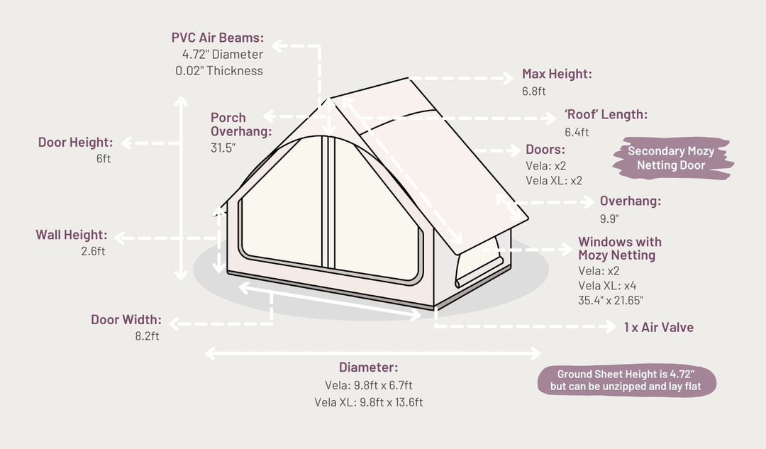 The Vela Air Tent is an inflatable tent designed for effortless setup. Just peg it down, connect the included battery pump, and it fully inflates in under 10 minutes. No hassle at all!
