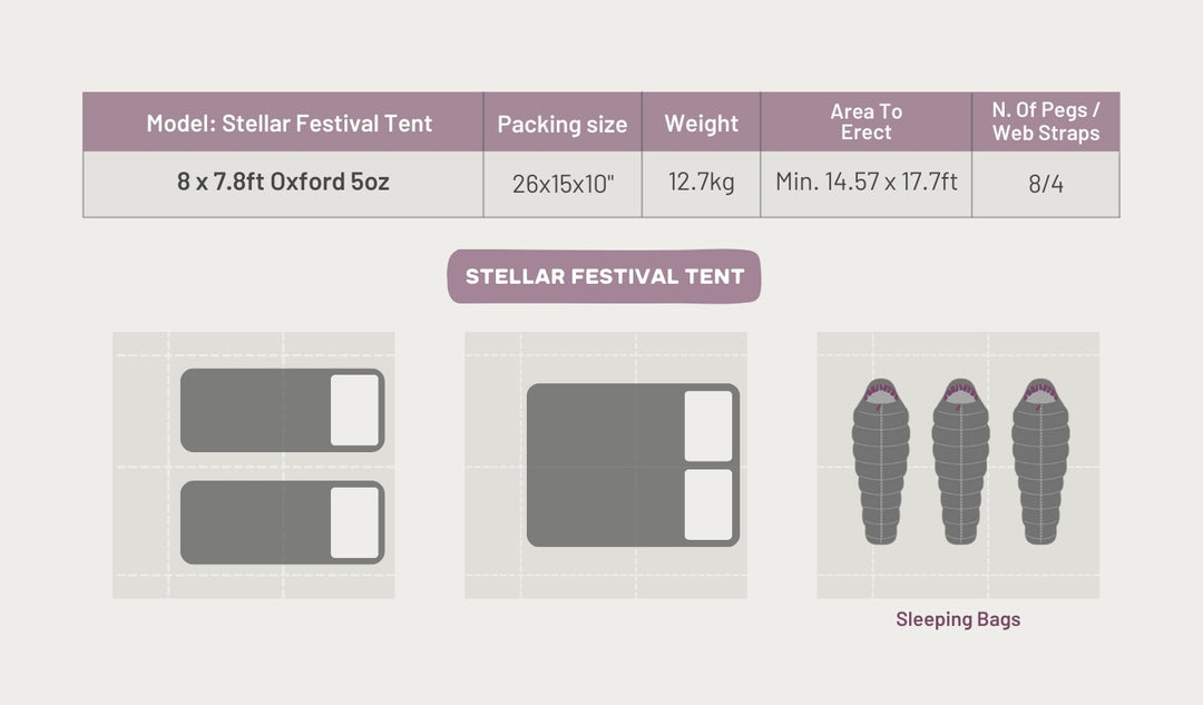 The Stellar is compact and best suited for couples or small groups of up to four people. It doesn't currently support an inner tent, as it's designed for simplicity and space efficiency.