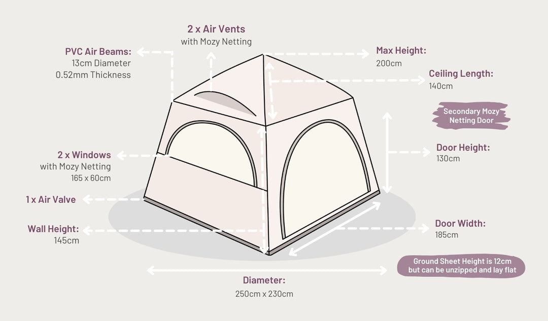 The Stellar is an inflatable tent designed for effortless setup. Just peg it down, connect the included battery pump, and it fully inflates in under 10 minutes. No hassle at all!