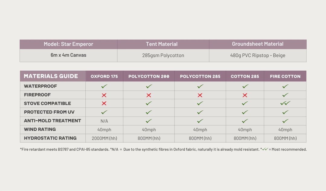 To enhance the Star Emperor Tent's durability, the fabric has been treated with a UV, rot, and water-repellent agent for longevity. Guy ropes have been replaced with resilient webbing straps.