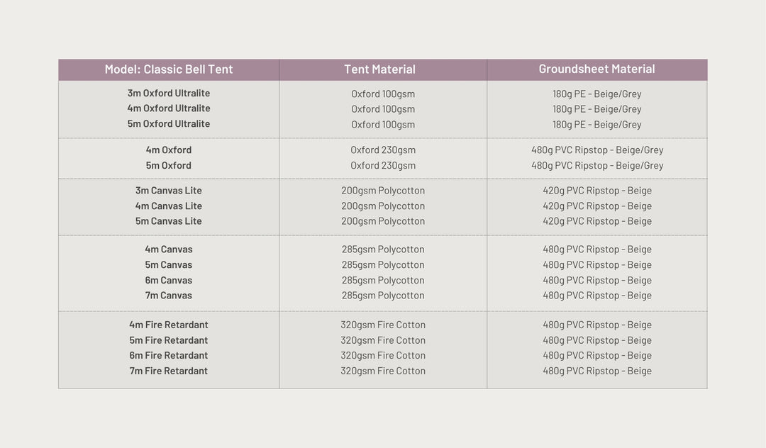 The Classic Bell Tent has seen an upgrade in the door height, with door heights increased on the 4m to 1.8m and the 5m+ to 2m. We have also made the centre poles stronger to enhance the overall performance.