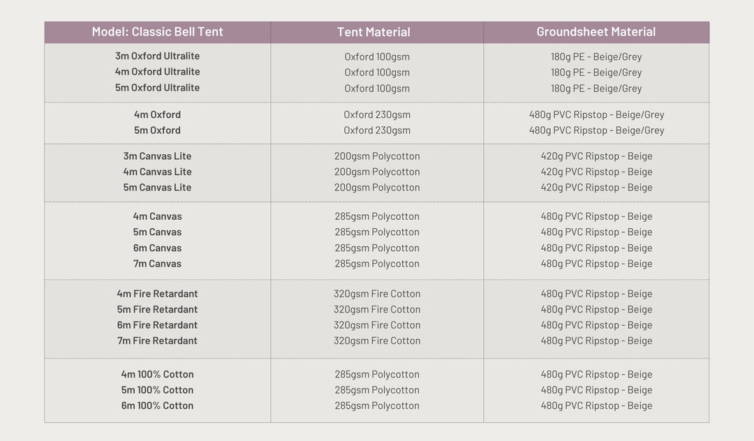 The Classic Bell Tent has seen an upgrade in the door height, with door heights increased on the 4m to 1.8m and the 5m+ to 2m. We have also made the centre poles stronger to enhance the overall performance.