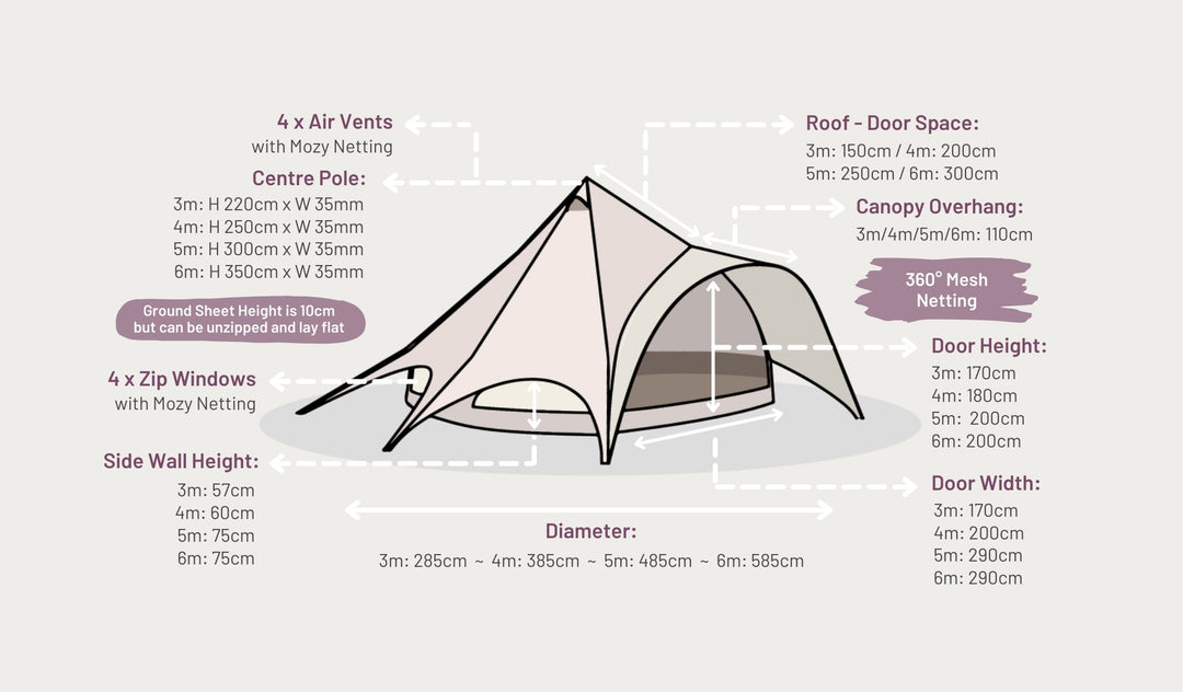 To welcome a bug-free breeze, unzip, roll and toggle the 360° mozy-netting. For a fully open plan apply the same technique to the tent wall.